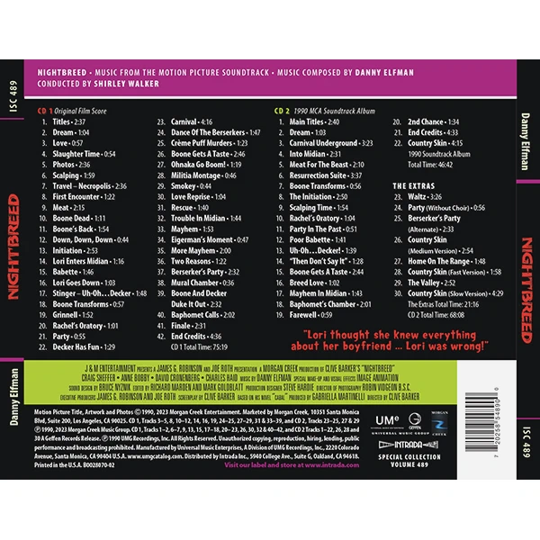 Intrada announces an expanded edition of Danny Elfman’s 1990 score to Clive Barker’s Nightbreed, which provided Elfman with the perfect opportunity to indulge in his first outright, gore-filled horror feature. As Elfman himself described his experience, “Nightbreed was great fun, and I loved working with Clive Barker. But it was a real difficult score, 75 minutes with a lot of different styles, very dense, difficult music that was very challenging. But as always, the harder it is the more I love it.” Not only did Nightbreed mark Elfman’s dive into a nightmarish fever dream, but it also marked his first significant use of world music in a film score. A South American pan flute, the shimmering beat of a Balinese gamelan and heated drumming all feature in this large orchestral work that is unique, but also clearly classic Danny Elfman.